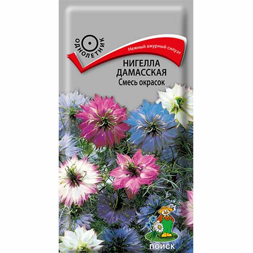 Нигелла Дамасская — смесь наиболее эффектных окрасок популярнейшего садового однолетника, который повсеместно используется в альпинариях и миксбордерах, как бордюрное и пристенное растение, в групповых и моносортовых посадках. На редкость неприхотливый однолетник, образующий сильно ветвистые кусты высотой около 45 см и многочисленные необычной формы полумахровые 5-сантиметровые цветки в окружении ажурных перистых листьев. Волшебное цветение продолжается с июня до августа, после чего растения образуют декоративные крупные, словно надутые воздухом семенные коробочки с «рожками». Во всех смыслах замечательный красиво цветущий однолетник, который должен быть в каждом саду. Источник: https://abekker.ru/product/nigella-damasskaya-smes-okrasok