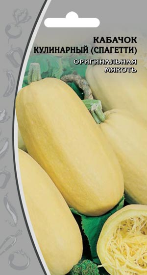 Позднеспелый (95-100 дней) кустовой сорт, тип спагетти, универсального использования. Плоды удлиненно-овальные, массой 1-1,5кг. Мякоть желтая, мелкозернистая, толщиной 2,5см, вкусная, при варке распадается на «макароны». Когда плоды светло-зеленые, их используют в кулинарии, как обычные кабачки. Чтобы мякоть при варке распадалась на «макароны», нужно дождаться, пока плод станет светло-желтым. Средняя урожайность сорта 330-370 ц/га. Ценность сорта: засухоустойчивость, стабильная урожайность, отличные вкусовые качества, длительное хранение благодаря твердой кожуре.
