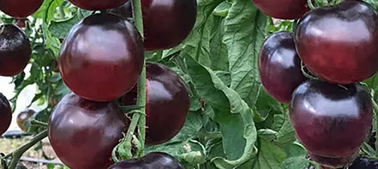 Раннеспелый сорт для пленочных укрытий и теплиц. Растение сильнорослое, слабооблиственное, высотой до 2 м. Куст формирует длинные, очень нарядные кисти, с 10-12 плодами. Плоды округлые, гладкие, плотные, массой 50-70 г, имеют интересную переходную форму цвета при созревании: от зеленой - к чёрной - до фиолетово-коричневой, с ярким блеском. Мякоть красная, сочная, сладкая. Урожайность составляет 9 -10 кг/м2. Это один из самых необычных и декоративных сортов, богат антоцианами и фенолом.