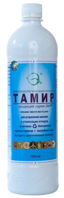 Тамир - микробиологический препарат, используемый для ускоренной утилизации органических отходов и устранения специфических запахов. Он состоит из нескольких десятков штаммов полезных микроорганизмов. С помощью препарата "Тамир", решаются проблемы загрязнения окружающей среды без ущерба для экологии. Препарат не токсичен для человека, животных и насекомых.