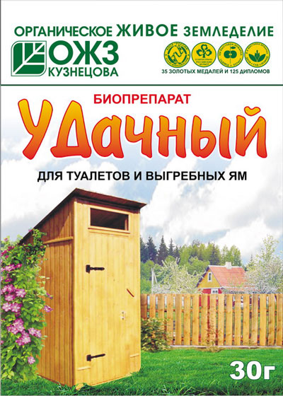Биопрепарат «Удачный» - для дачных туалетов и выгребных ям. Эффективно разлагает и разжижает органику, устраняет неприятные запахи, безопасен для людей, животных, растений.