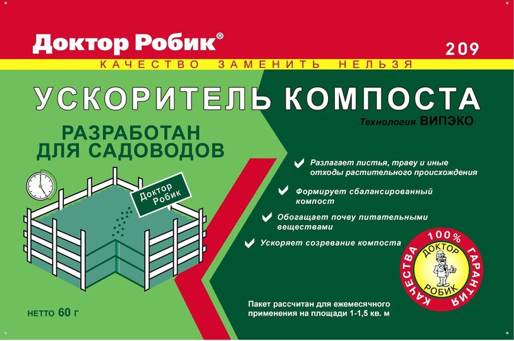 Рекомендации по применению: Применять раз в месяц. Доктор Робик 209 не содержит едких веществ, безвреден для окружающей среды. Перед применением компостную яму/кучу полить водой.