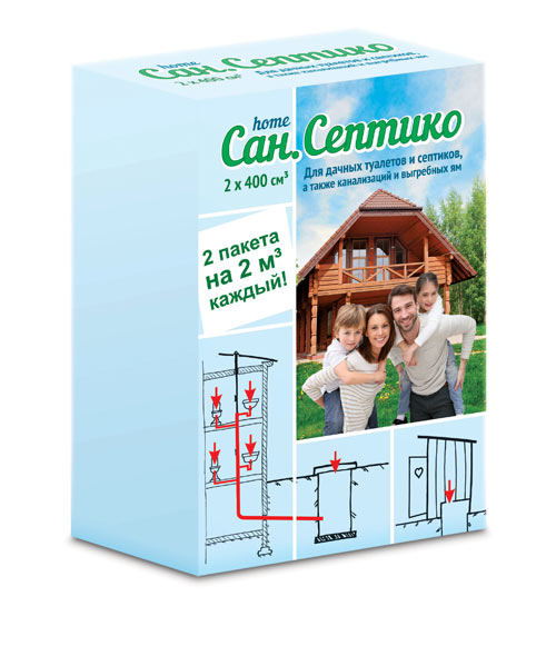 «Сан.Септико» — препарат для дачных туалетов, септиков, канализаций, выгребных ям (пакет 400 куб. см) Это биологический препарат, предназначенный для биоконверсии органи­ческих веществ (фекальных, жировых, хозяй­ственно-бытовых стоков). Состоит из живых микроорганизмов, способных перерабатывать жиры, органические отложения и естест­венные отходы;